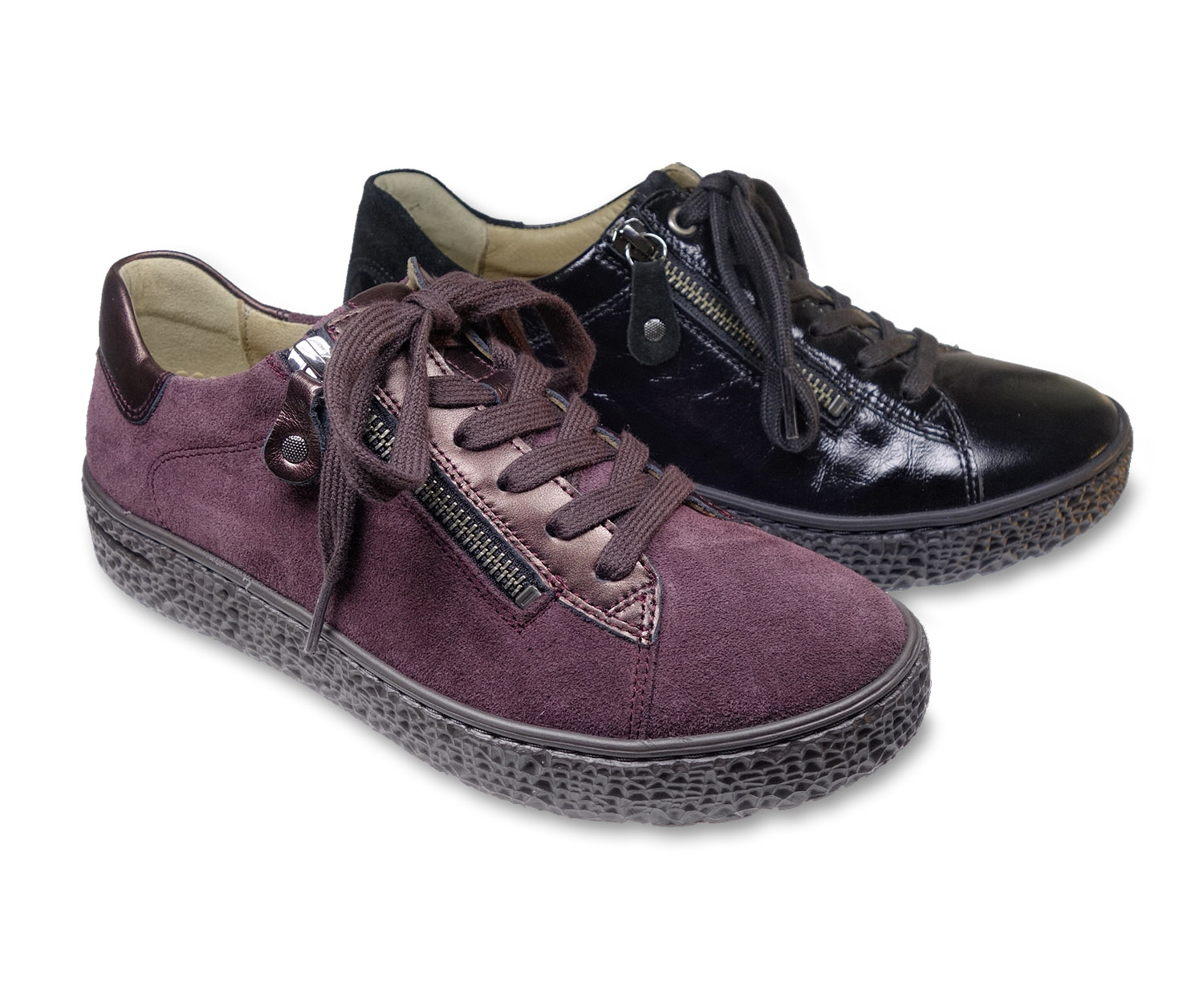 Veloursleder bordeaux, Lackleder schwarz